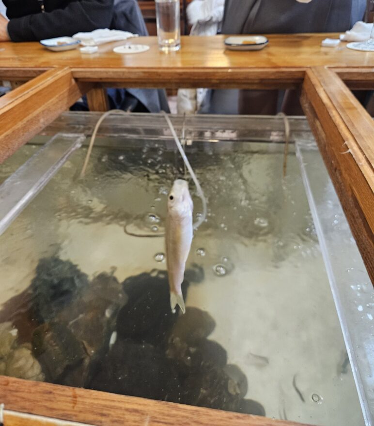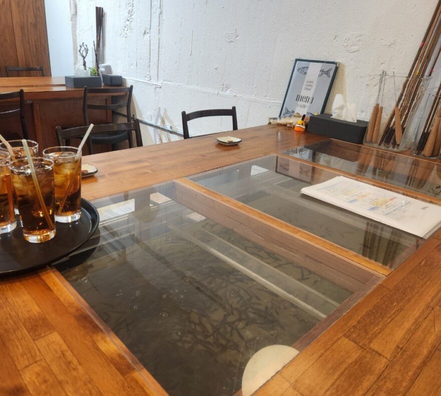 「神田つり食堂サクラ」さんでは、テーブルの下に水槽が!