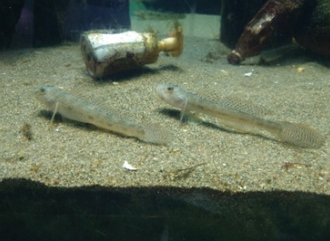 マハゼの仲間たちが泳ぐ水槽。透明なひれ。砂にもぐる前の一瞬だけ見せる鋭い眼。